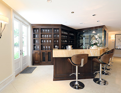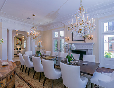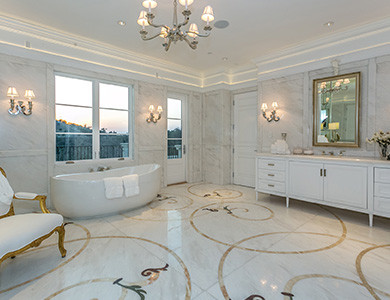 Wrought iron railings, parquet, limestone and marble flooring, wall paneling, exposed beams, and custom designed molding and trim; are the exclusive designed components implemented to decorate this prestigious home.