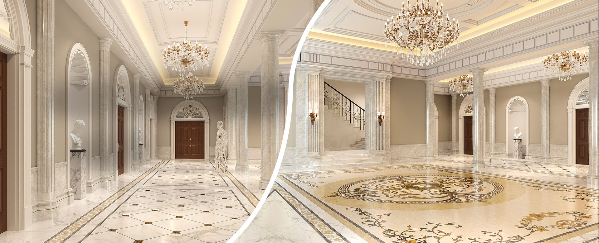 We offer comprehensive entrance design solutions, including patterned flooring, wall treatments, and lighting design, to create a space that exudes both ceremony and warmth. Every detail marks the beginning of life inside and reflects the homeowner’s refined taste.