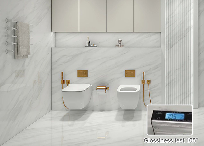 A gloss level of 95° is considered luxury-grade, yet Milano White Marble achieves an exceptional surface gloss of up to 105°, far exceeding conventional standards.
