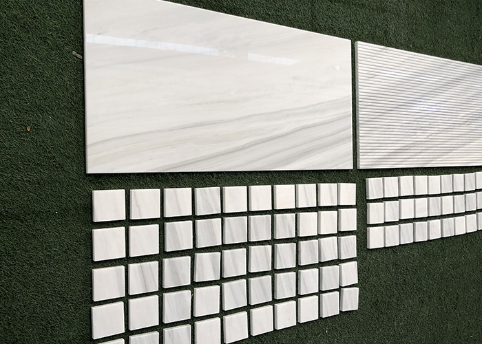 Custom-cut Milano White marble tiles and thin panels tailored to your project drawings.
