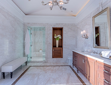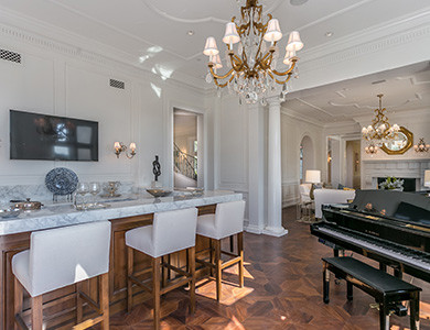 Wrought iron railings, parquet, limestone and marble flooring, wall paneling, exposed beams, and custom designed molding and trim; are the exclusive designed components implemented to decorate this prestigious home.